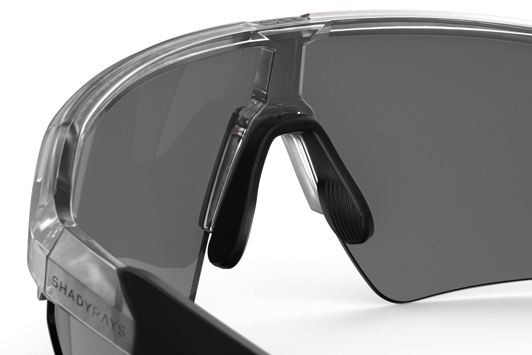 - No-slip fit- rubber adjustable nose pad with air-flow sweat channels. and dual injected rubber temple tips.