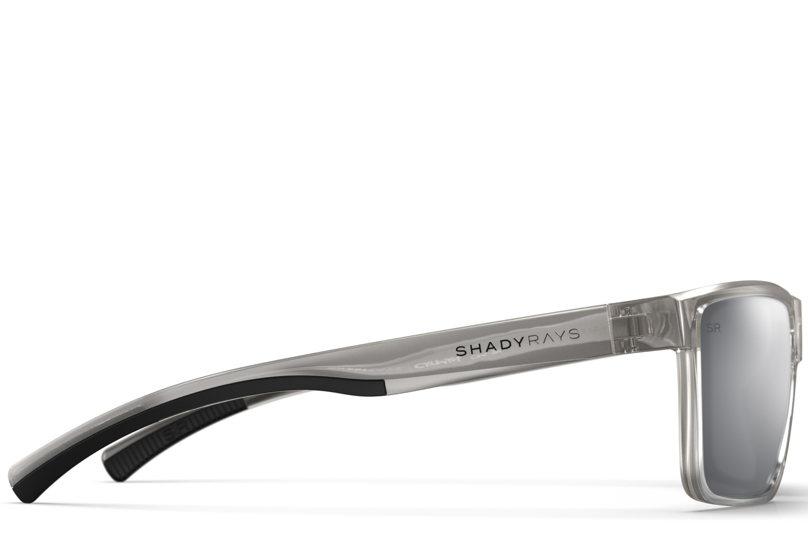 - Gloss transparent smoke grey TR-90 frame with raised logos.
