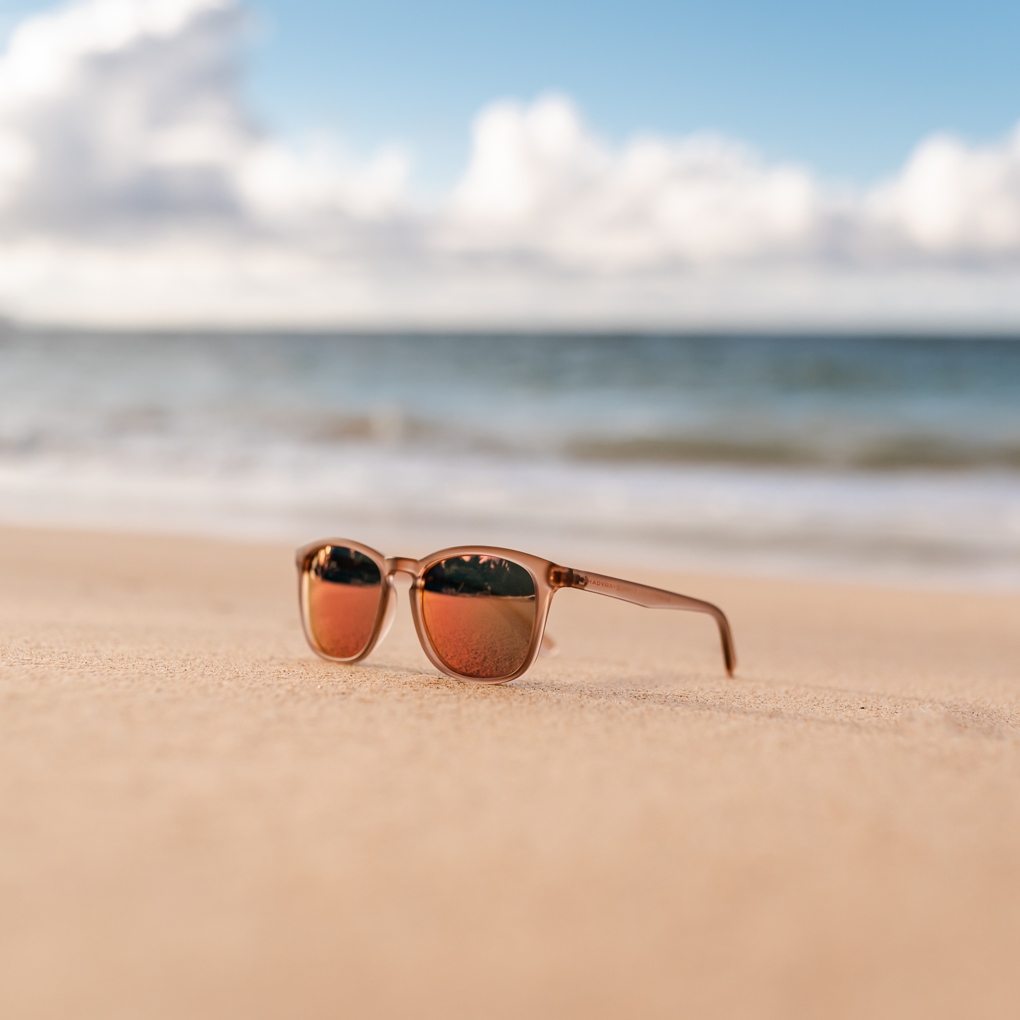 - Polarized. peach mirrored lenses with bronze tint: 100% UV protection / shatter-resistant / salt water resistant