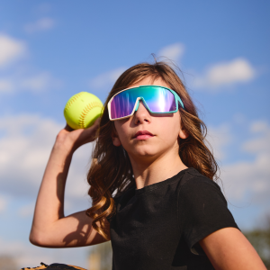 Single-lens sport frame built for young athletes who play hard and move fast. Designed for ages 6 to 12. It offers a full coverage. sharp clarity. and rubber accents that keep it locked in place throughout every inning. Sprint or spike.